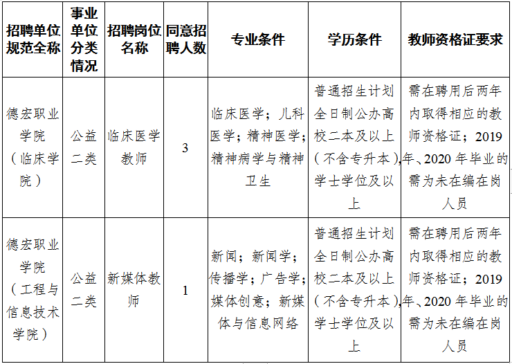 根据《中共德宏州委机构编制委员办公室会关于同意2021年度德宏职业学院选优的批复》(〔2021〕3号)、《中共德宏州委机构编制委员办公室关于同意2021年度德宏职业学院引进研究生的批复》(〔2021〕10号),核定我校2021年考核“选优”招聘教师4名、引进研究生10名。按照《德宏州人力资源和社会保障局关于印发2021年教育卫生部门考核招聘紧缺专业学科优秀人才工作方案的通知》(德人社发〔2021〕11号)的相关要求,现将德宏职业学院2021年考核“选优”招聘教师、引进研究生工作的相关事宜公告如下: