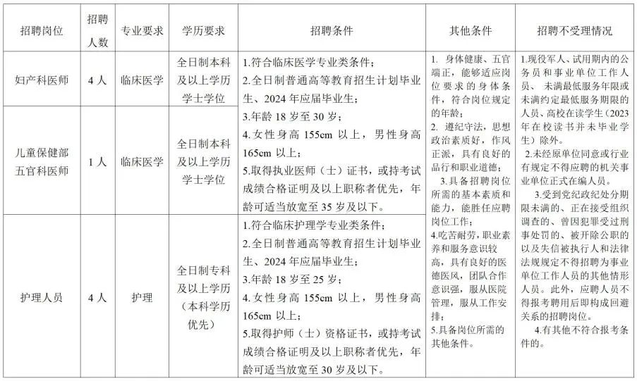 (2)应聘者须提供证件材料:本人有效身份证、个人简历(自荐表)、毕业证书(学位证书)、在校学习成绩单、资格证书及执 业证书、学校荣誉证书等相关证件原件及复印件一份;2024年应届毕业生须携带《就业推荐表》原件和复印件一份,现场报名提交的相关证件原件,现场审查后退回本人 。
