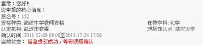申请人网上申报填报申请信息成功,但尚未到认定机构指定的现场确认点提交申请材料和确认个人网上申报信息时,其申请状态为“信息提交成功,等待现场确认”。如下图所示: