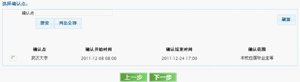确认点列表中会显示所选认定机构网报时间段内所有参与确认工作的确认点信息供申请人选择。如果没有选择确认点,点击“下一步”时,会给出提示。
