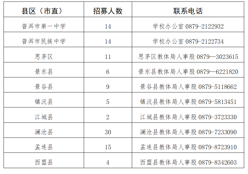 2024年秋季学期普洱市计划招募基础教育银龄教师110名,招募县区、人数和联系方式如下(具体岗位需求详见附件):