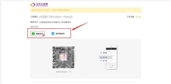 3、进入光大云缴费界面,选择“微信支付”或“支付宝支付”,扫码支付: