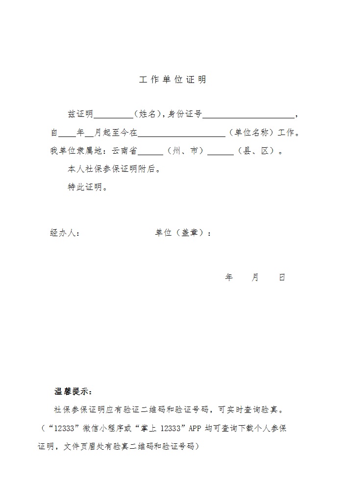 2.实际工作地在单独划线地区的工作单位证明(必须包括姓名、身份证号、工作单位及工作所在地地址等,样表在www.ynxr.com云南软考网2025年上半年报名通知附件下载)、本人在单独划线地区社保参保证明(加盖单位公章)。社保参保证明应有验证二维码和验证号码,可实时查询验真。(“12333”微信小程序或“掌上12333”APP均可查询下载个人参保证明,文件页眉处有验真二维码和验证号码)