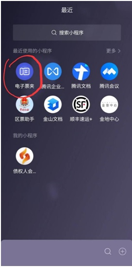 2、注册之后,点小程序中间的“票夹”按钮,就可以查看和下载已经开出的电子票: