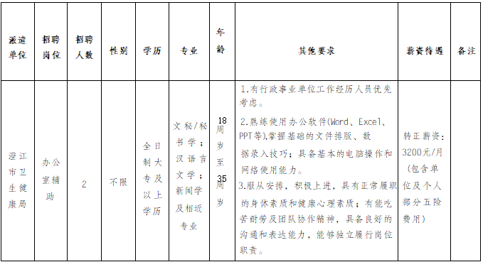 澄江市卫生健康局因工作需要,委托澄江市启澄人力资源有限责任公司,面向社会公开招聘行政辅助工作人员2名, 现将有关事项公告如下: