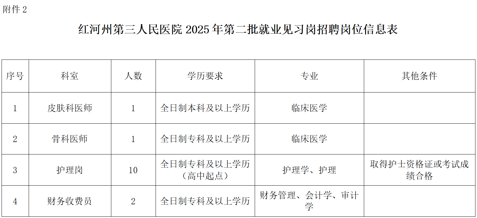 详见附件2:红河州第三人民医院2025年第二批就业见习岗招聘岗位信息表