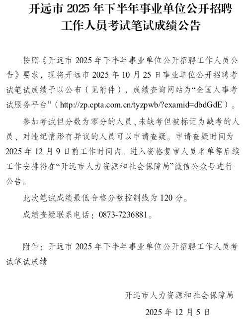 附件:开远市2025年下半年事业单位公开招聘 工作人员考试笔试成绩公告