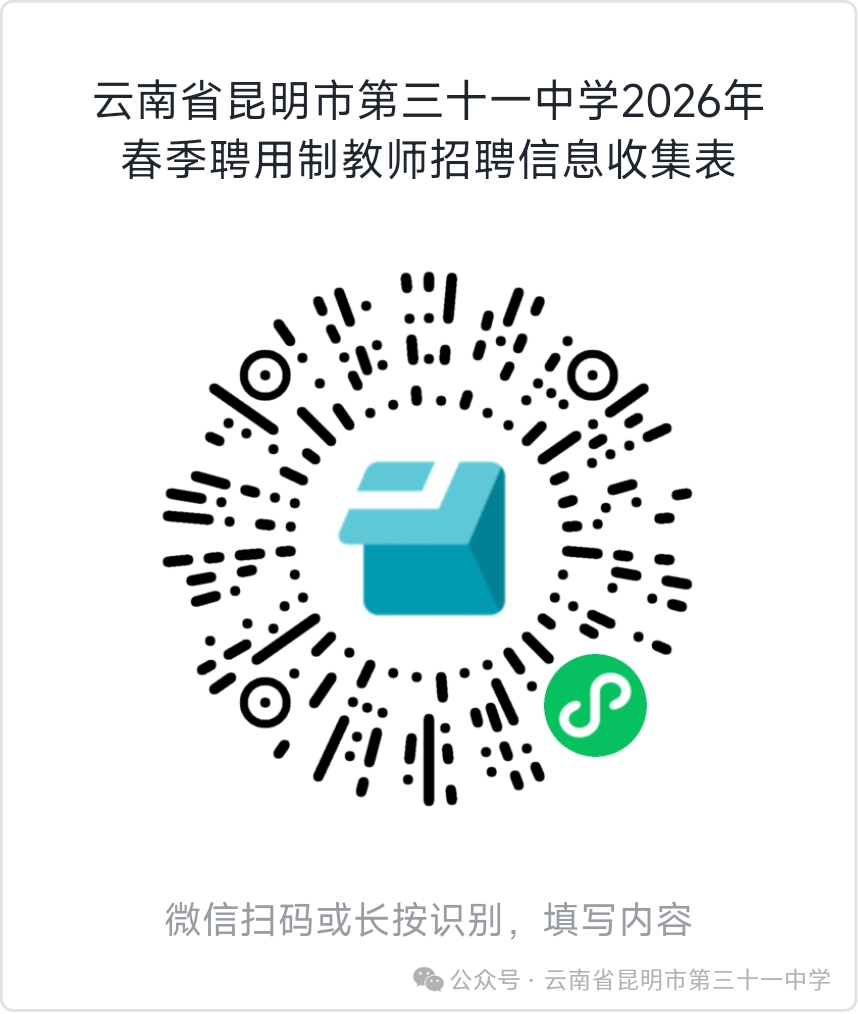 2.报名方式:本次招聘报名采取网络报名的方式进行,应聘人员须在规定的时间内扫描公告末尾二维码进行网络报名,按《云南省昆明市第三十一中学2026年春季聘用制教师公开招聘公告》报名要求填写各项信息。网络报名时间截至2月28日下午18:00。