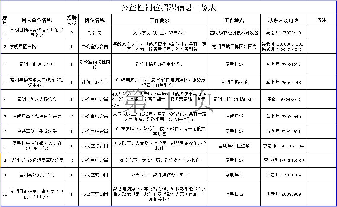 招聘具体事宜请咨询用人单位。符合公益性岗位上岗条件的个人也可以到嵩明县劳动就业服务局综合科申请公益性岗位求职登记,详询陈老师:0871-67917444。