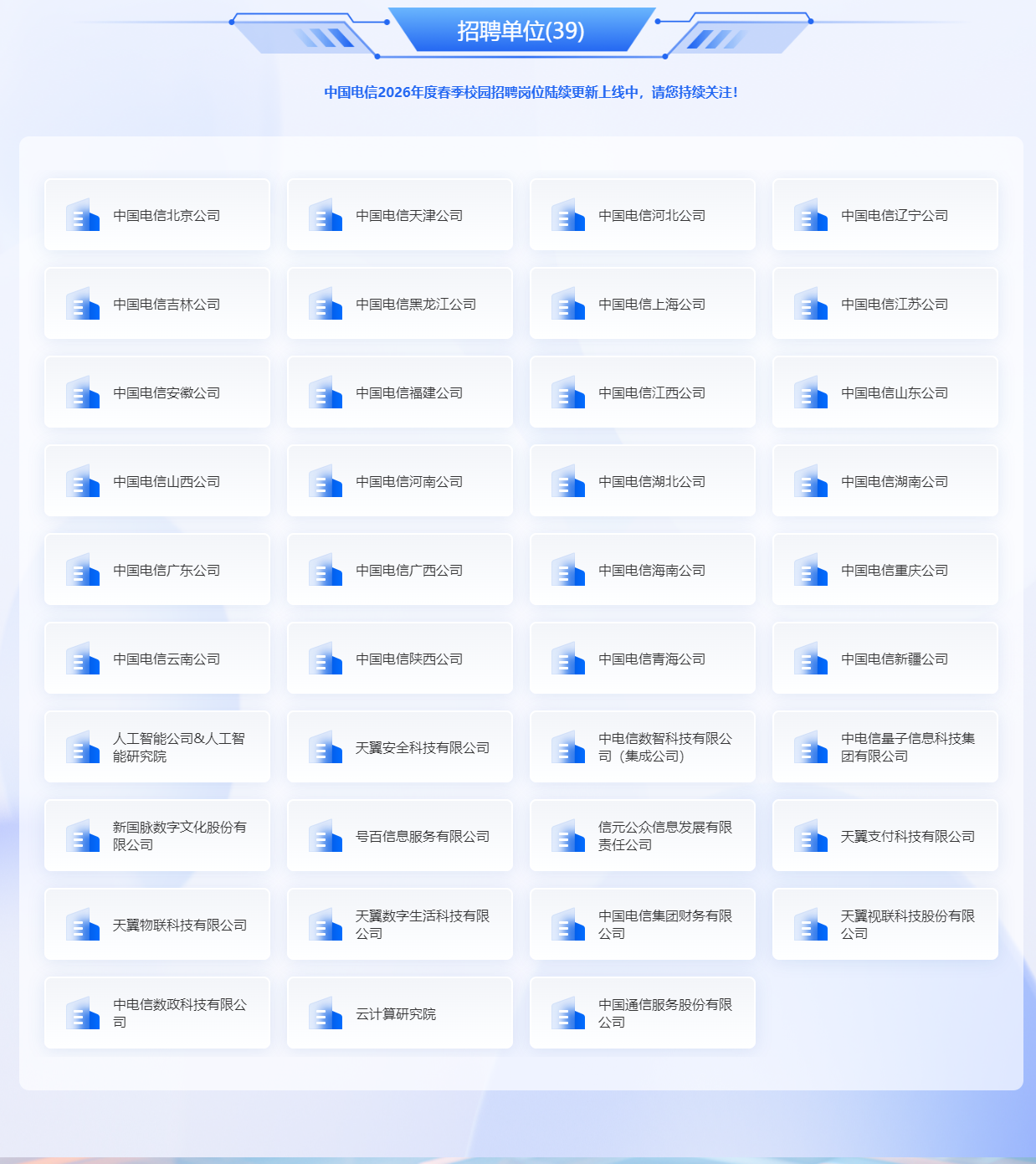 中国电信集团有限公司携下属分子公司和专业机构,正式启动2026年度春季校园招聘活动,面向国内外普通高等院校诚聘英才。