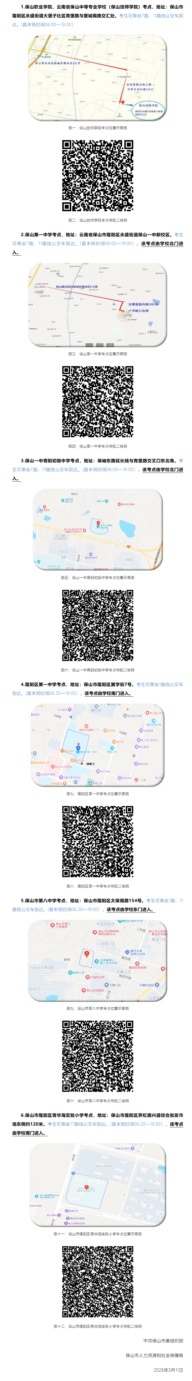 (一)本次考试共设置6个考点,分别为保山职业学院、云南省保山中等专业学校(保山技师学院)考点、保山第一中学考点、保山一中青阳初级中学考点、隆阳区第一中学考点、保山市第八中学考点、保山市隆阳区青华海实验小学考点。