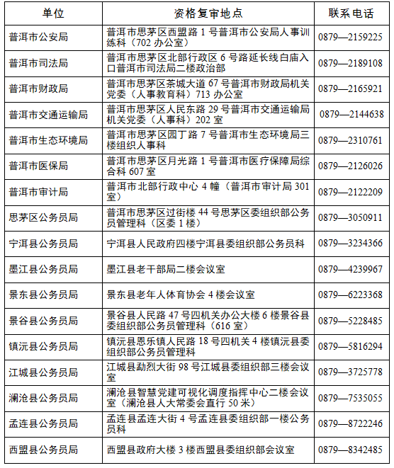 附件:普洱市2026年度考试录用公务员资格复审地点及联系方式
