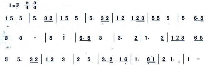 35.在答题卷上重写下列曲谱,按指定拍号画出小节,并按音乐旋律进行加以正确的节奏组合。